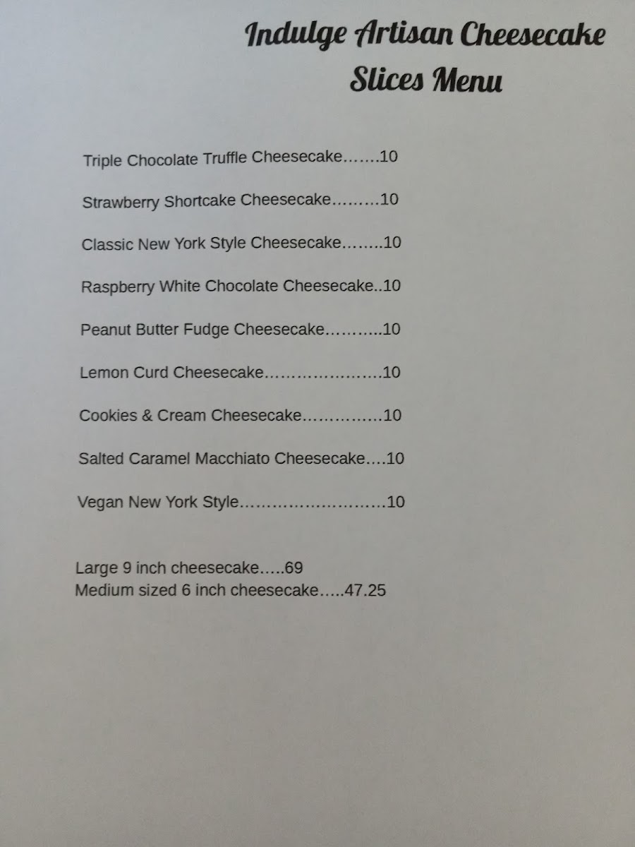 Indulge Artisan Cheesecake offers a menu that feels inviting and thoughtfully crafted, perfect for those moments when you want to enjoy a comforting yet distinctive dessert or a casual breakfast. The selection leans heavily on rich, satisfying cheesecake slices with an emphasis on gluten-free options, ideal for anyone seeking indulgence without compromise.